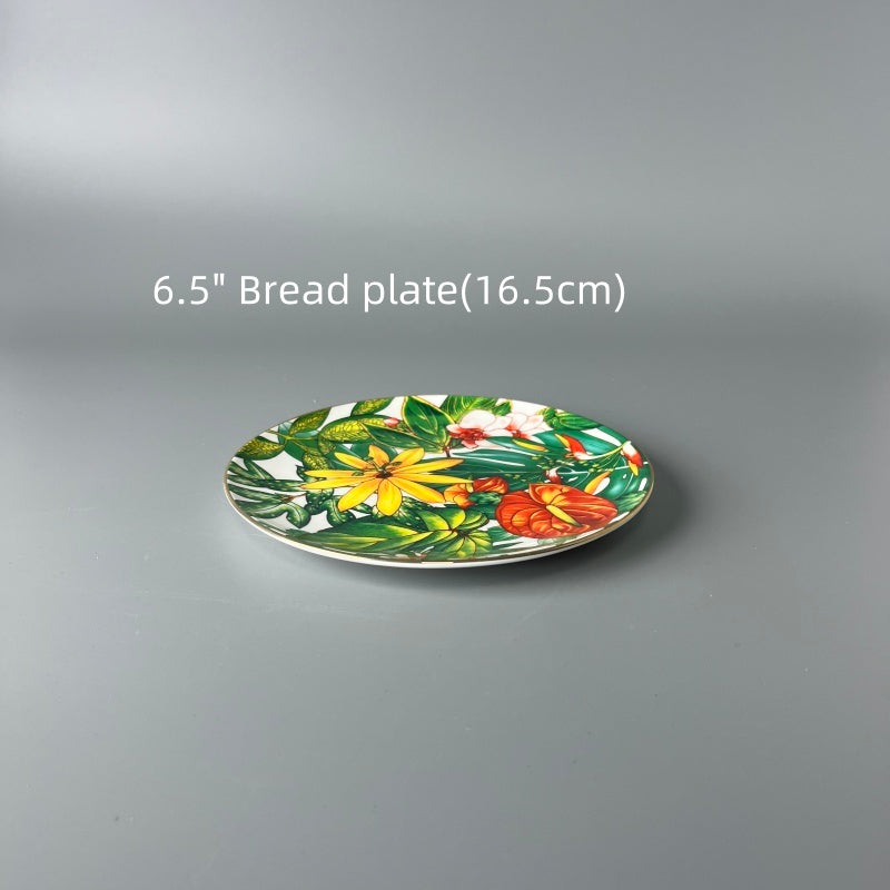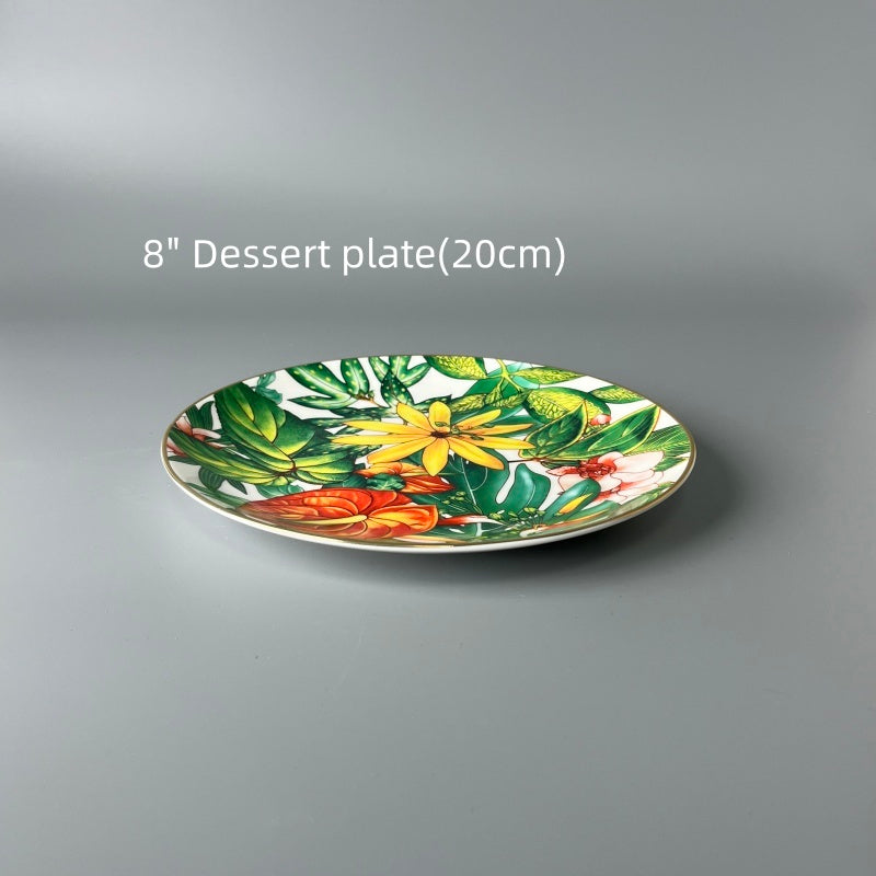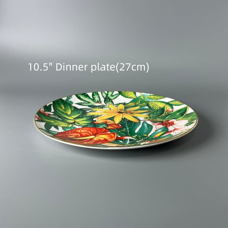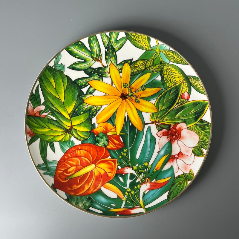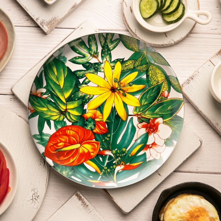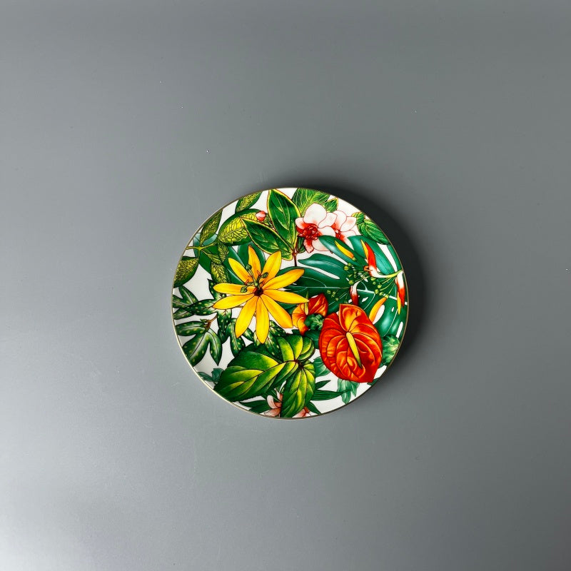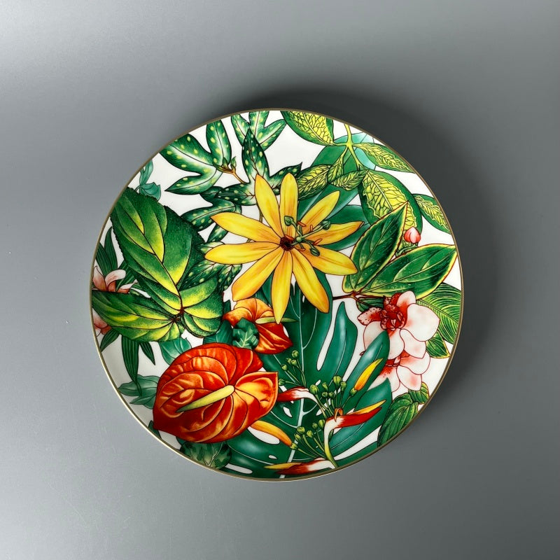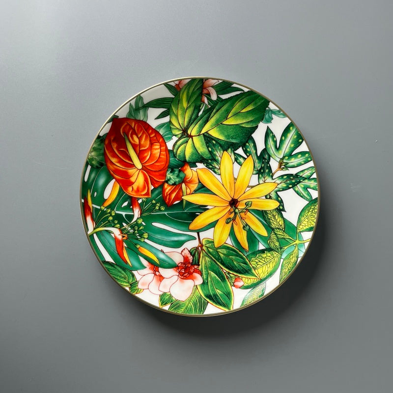 This is a porcelain plate. The pattern on the plate surface mainly consists of vivid tropical flowers and green leaves, including yellow flowers, orange - red flowers, pink flowers, and green leaves of various shapes. It presents a rich tropical style, lively and full of vitality, and can be used to serve fruits, pastries, etc.