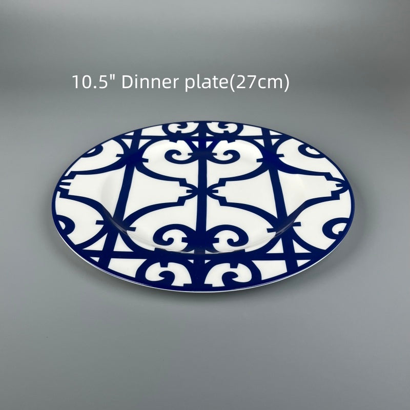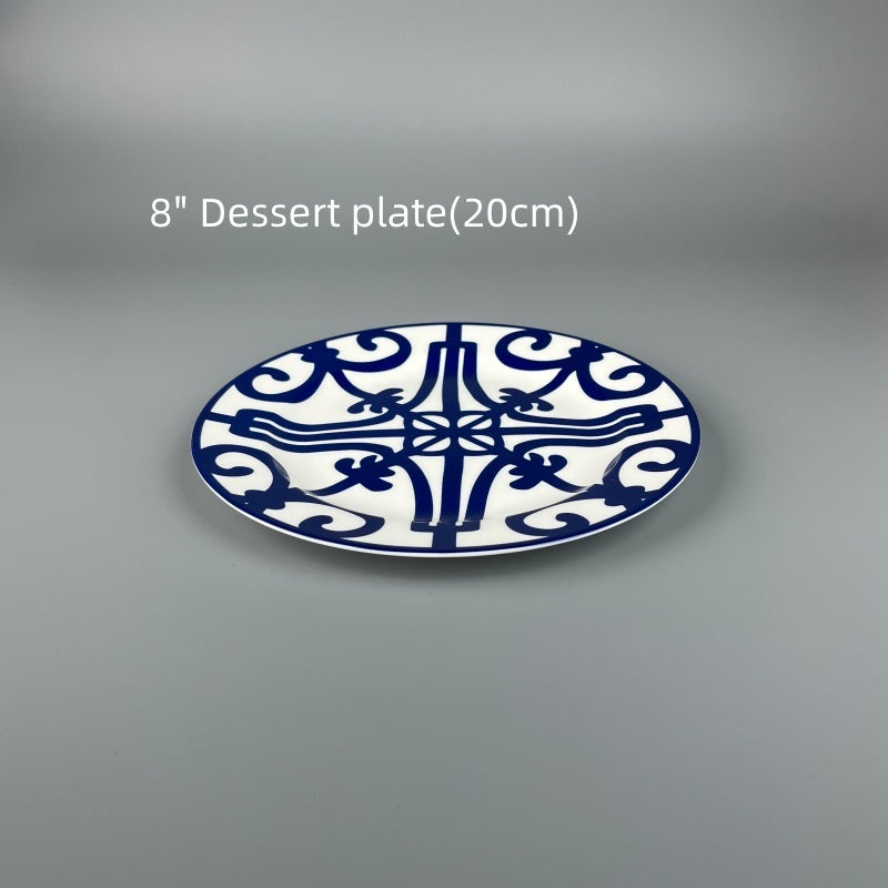 This is a bone china plate. The pattern features a blue - and - white geometric interwoven design, with an artistic touch reminiscent of Nordic wrought.
