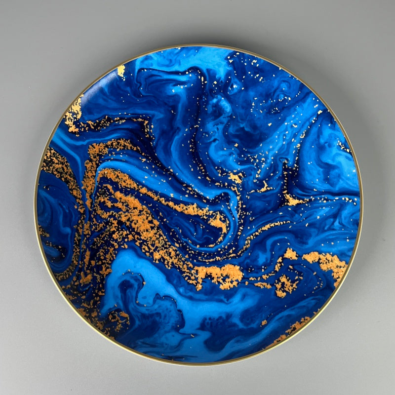 The plate surface is mainly blue, with flowing textures like quicksand, dotted with golden spots and paired with a golden rim. It has a luxurious and gorgeous style, suitable for use in star - rated hotels and can also serve as a decorative plate for cakes.