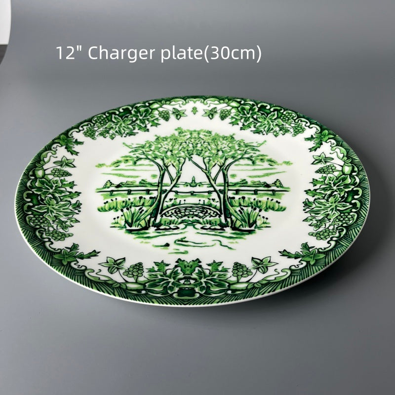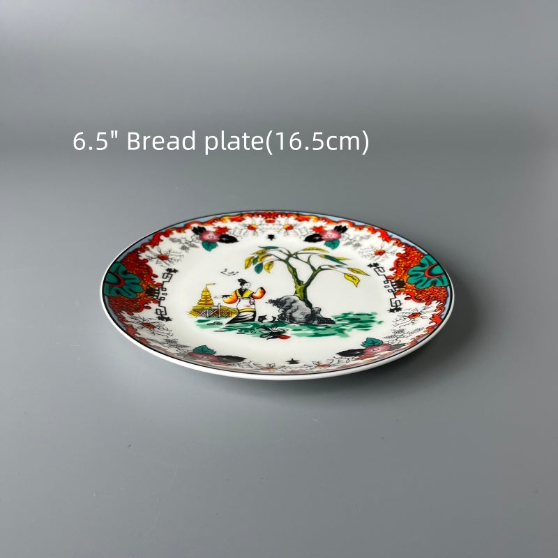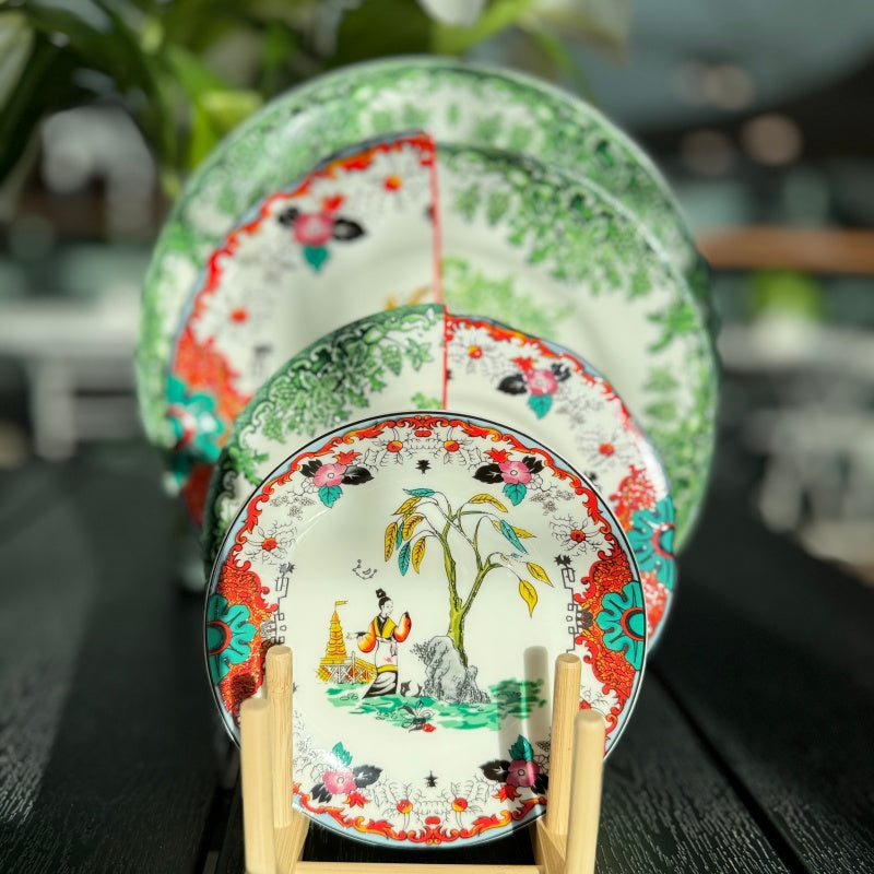 The pattern style of this porcelain plate is truly ingenious, presenting a wonderful blend of beauty. On the left side, fresh green serves as the main tone, depicting natural scenes. It is full of the pursuit of natural artistic conception in traditional Chinese paintings, with delicate brushstrokes that convey a sense of tranquility and remoteness.On the right side, vivid colors such as red, orange, and pink are used. The decorative patterns are elaborate and exquisite, exuding a rich flavor of folk art. The strong contrast of colors makes it lively and full of dynamism.