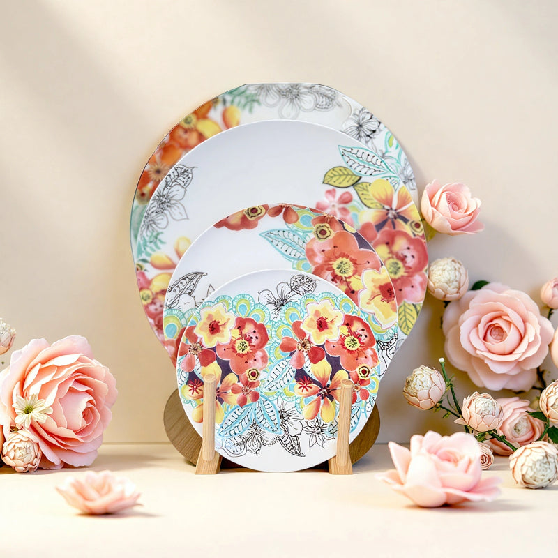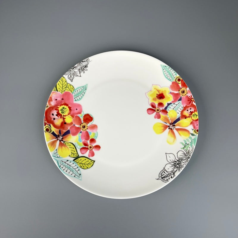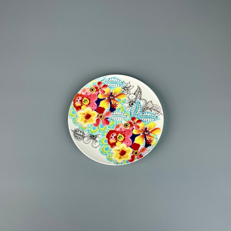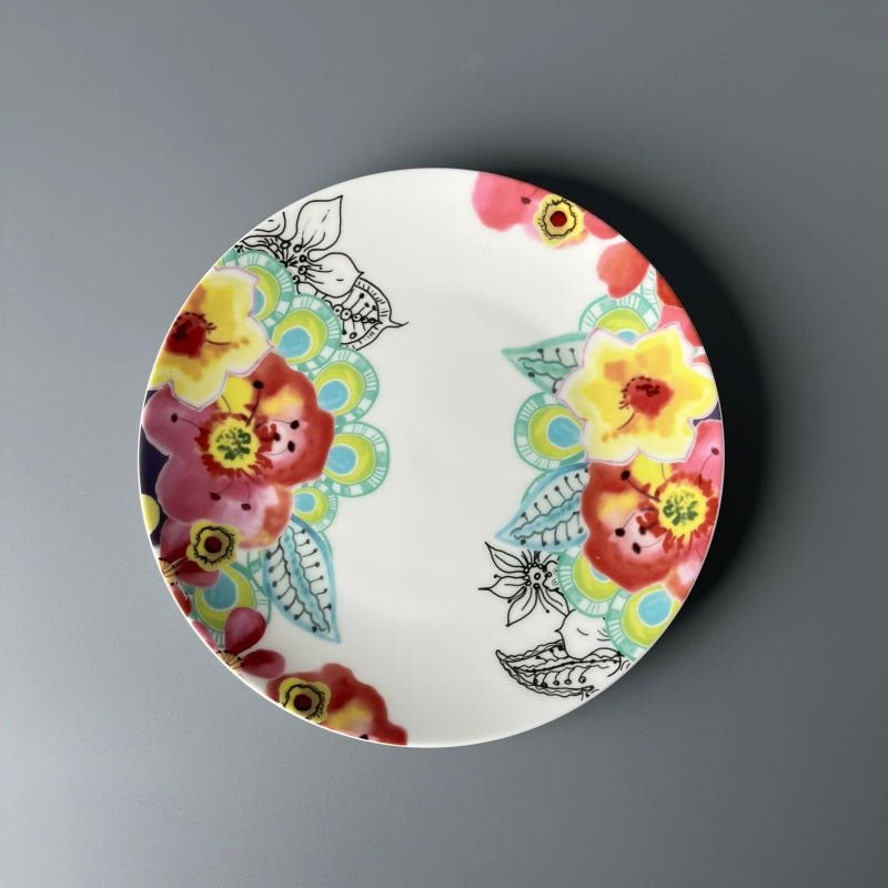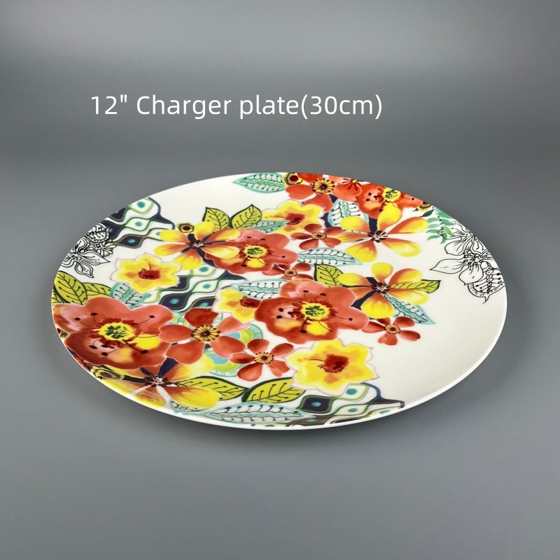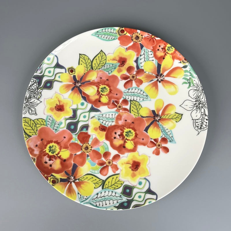 The pattern on this plate mainly features flowers. It is brightly - colored, with red and yellow flowers paired with green leaves, and geometric patterns interspersed. Overall, it presents a lively and artistic decorative style.